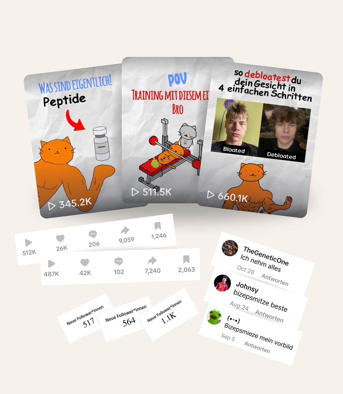 Mit der Bizepsmieze haben wir einen Fitness-Kanal aufgebaut, der Wissen und Humor verbindet. Eine starke, markante Katze erklärt Muskelaufbau so, dass man ihn versteht – und wirklich durchzieht.